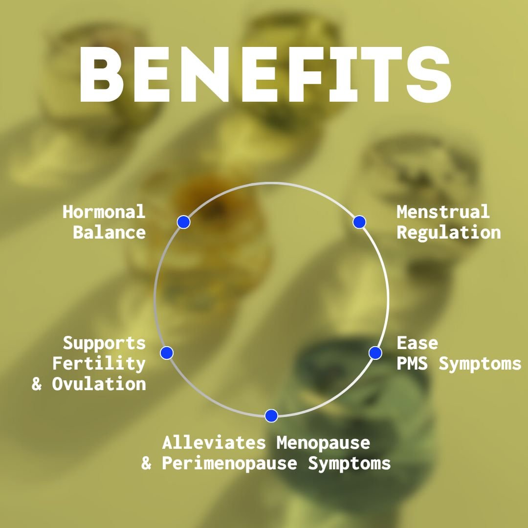It alleviates PMS symptoms by stabilizing hormonal fluctuations, supports ovulation and fertility, and addresses hormonal acne by restoring hormonal balance.